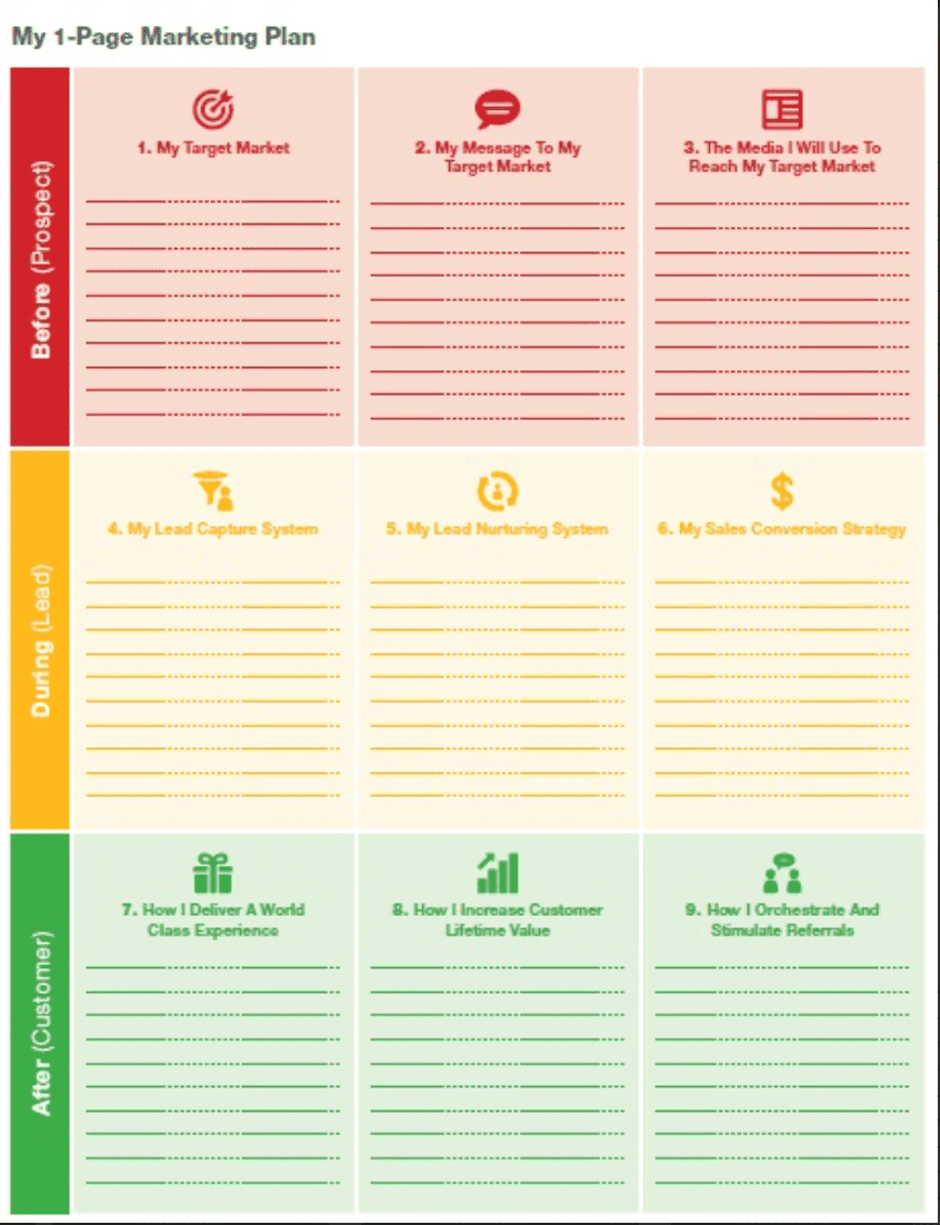 Each area on the 1-Page Marketing Plan Canvas is categorized by the different stages or phases of the customer journey: Before, During, and After. Each phase marks the process of turning prospects into a loyal customer.