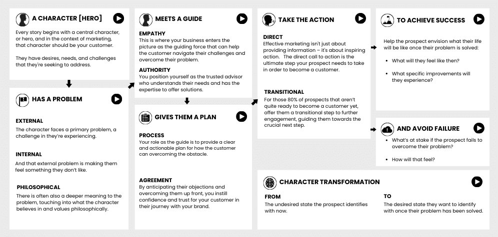 Similarly, within the StoryBrand Framework, the customer takes on the role of the hero of the story, facing challenges along their journey. In this narrative, your brand switches to the role of the guide, offering a clear pathway for the hero to navigate through their obstacles.